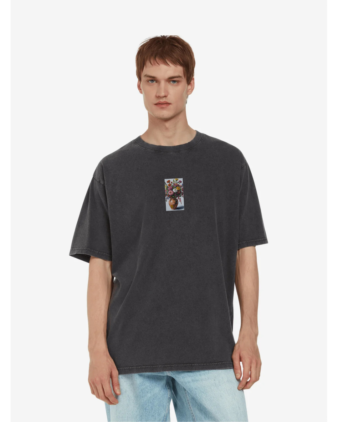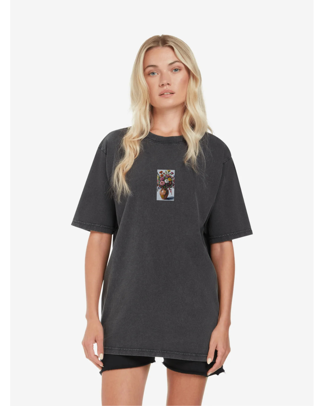 Unser oversized Unisex-Shirt bringt ein kleines Kunstwerk auf Baumwolle: ein zarter Blumenstrauß in einer Vase – gemalt in sanften Ölfarben.